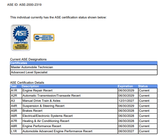 All certifications are current through 2027–2029. You’re booking with a verified ASE Master Technician who brings shop-quality service straight to your driveway.